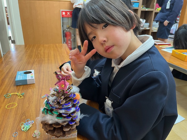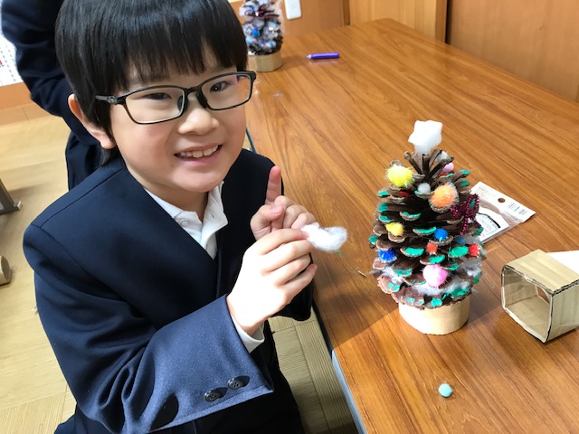 周南カントリークラブさんより頂いた大きな松ぼっくり!素敵なクリスマスツリーができました。ありがとうございました!