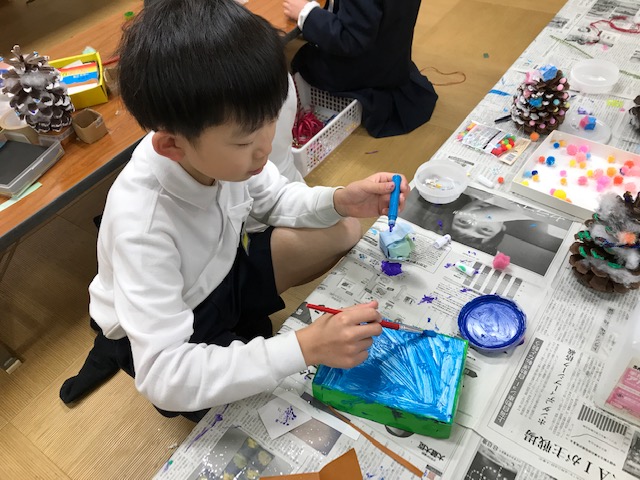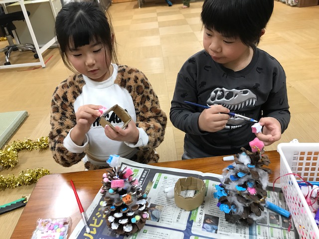 大きな松ぼっくりに星を飾ったり、色を付けたり、絵の具遊びはみんな大好き。お家ではなかなかできないので、ほがらか児童の家ではできるだけたくさん絵の具を使った遊びをしています。