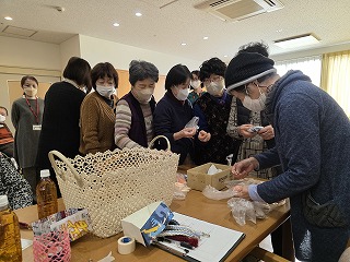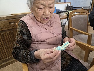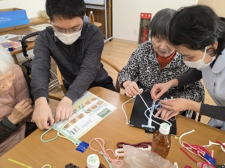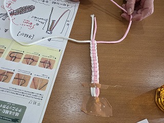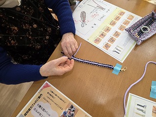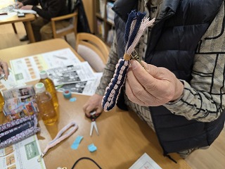 2026.01.27 第96回カフェドほがらか♪(組紐ストラップ) カテゴリー: カフェ 新着 こんにちは!奥村です。 あけましておめでとうございます。 今回のカフェドほがらかは「組紐でストラップ」!紐を使って「平結び」という方法で編んでいきました。ひとたび覚えればいろんなことに使えるので、ぜひ覚えてほしいものです。 来月2/8切山歌舞伎の公演に私、奥村5年ぶりに復活いたします。 ぜひ、みにきてください。 一覧へ戻る
