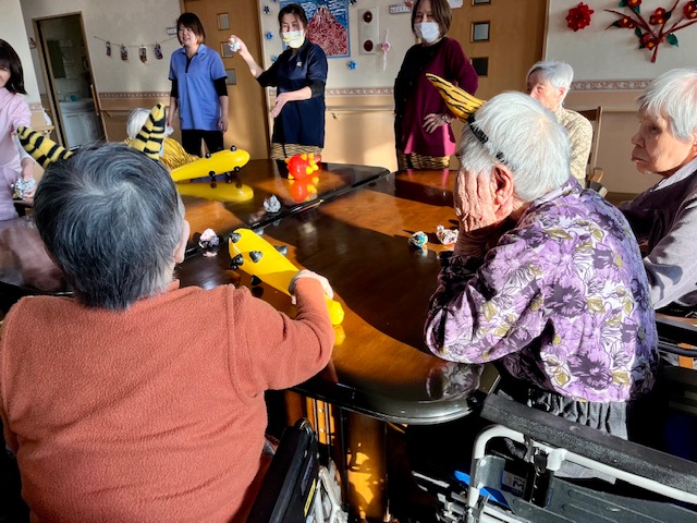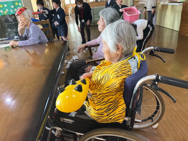 おばあちゃん立って豆を投げておられました。お元気ですねー。施設長をはじめ、スタッフの皆さんも可愛い虎柄パンツで鬼になられていました。