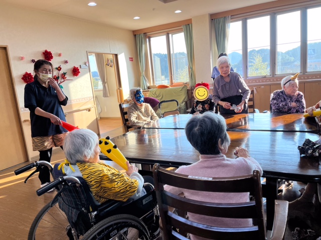 虎模様のエプロン可愛いいですね。新聞紙を丸めて豆を作ったり、おばあちゃん達みんな角や鬼のお面を付けたり、準備が大変だったと思います。