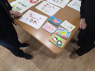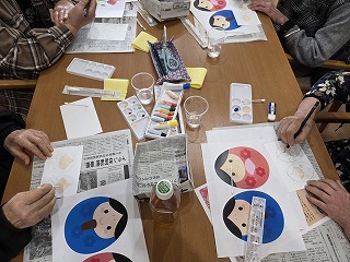 皆様、こんにちは。奥村です。今回のカフェのクラフトは「ぽんぽん絵手紙」でした。この企画は、「今日は何の日」をテーマにしたつどいの中で、2月3日の節分だけでなく、「文(ふみ)23の日」でもあることから着想を得ました。参加者の皆さんには、綿棒を使ってポンポンと突つきながら絵手紙を作成していただきました。