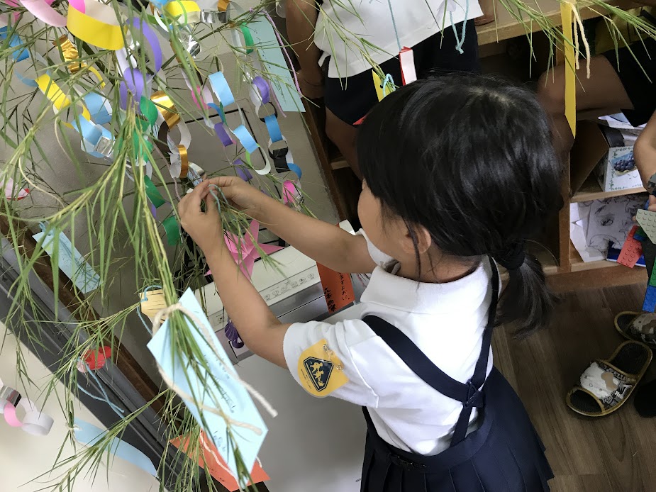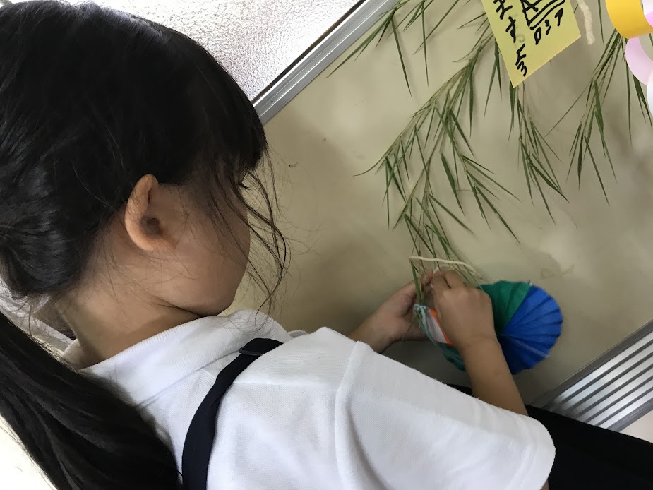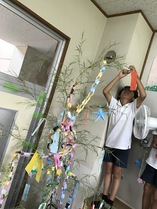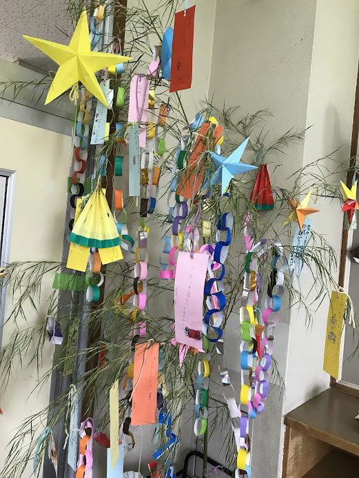 高学年は高いところ…低学年は低いところに飾りつけをお願いしています…