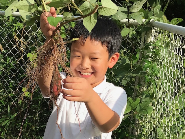 おいもとれたよー 暑かったねー 汗タラタラです。 あった、あった! 宝さがしみたい。 ぼくのが一番大きいよー。 少しの油で、サツマイモフライを作ってたべます。みんな大好き! 塩となぜかマヨネーズで。