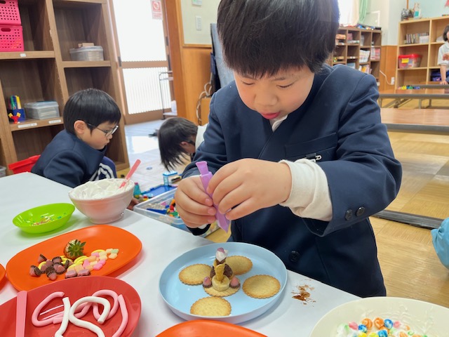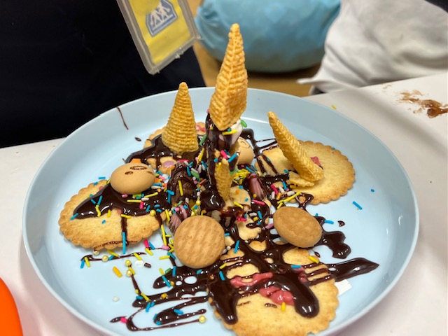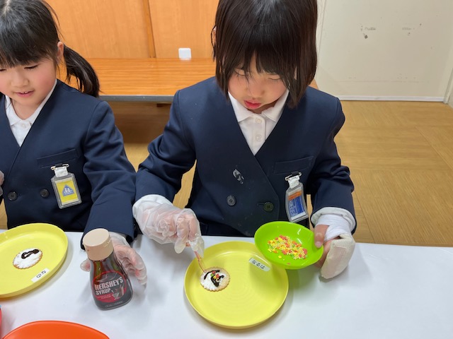 パティシェR君 クッキーの上にチョコレートシロップをかけ、その上にとんがりコーンやカラフルスプリンクルをかけています。